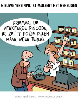 Einliks bin ik oan bar en begjin entûsiast de boadskippen op de bân te setten. Ik skou myn kaartsje troch it pinapperaat mar it ding seit “foute koade”. Dan mar foar de twadde kear: it ding seit wer it selde. Ik wurd senuweftich en druk it kaartsje noch mar ris troch it apparaat. Wylts it famke my warskôget om it net foar trèdde kear te dwaan gean ik troch. De minsken krije mei my te dwaan. De iene tinkt: “Se sil wol read stean.” en in oare ien fynt fèst: “It is in âld minske. Se wit it nûmer net mear.” Ik lit de boadskippen mar stean en sis tsjin it famke: “Ik sil jild ophelje…” en lit alles yn panyk efter .