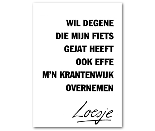 “Mem, nò is myn fyts alwèr stellen!” Us soan komt pûr lilk thùs fan skoalle. “Hiest him net op slot tink.” is myn reaksje. “En juster ha ik him noch plakke litten by Hanske de fytsmakker.” giet hy fjirder. De safolste fyts is foart. Wy keapje ùs earm oan fytsen en keapje allinne noch mar twadde- as treddehâns. Ik ha skjin myn nocht fan dy stellery en sis tsjin him; “Dan snapst dochs ien wèrom… ”