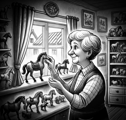 Ik bin op besite by in freondinne en ha sa’n hynderke meinaam. Sy sammelt se sawol yn it grut as yn it lyts, fan hout en fan stien. Har heit wie eartiids boer mei foarleafde foar hynders. ‘It sil der wol wei komme…’, tink ik. Se hat ûnderwylst in plakje fûn en wiidweidich ferhellet se wer de bisten allegearre wei komme.