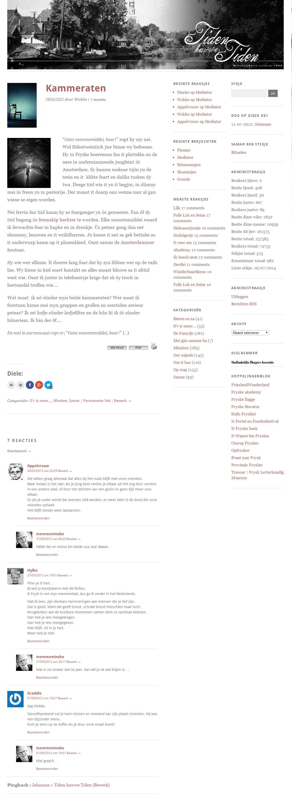 Hy wie wer allinne. It duorre lang foar dat hy syn libben wer op de rails hie. Wy hiene in hiel soart kontakt en alles moast bliuwe sa it altiid west wie. Oant ik juster in telefoantsje krige dat ek hy troch in hertoanfal troffen wie….