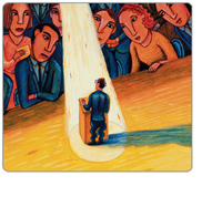 Om barren moatte wy ùs foarstelle. “Wa bisto? Wat dochsto? Wat is dyn achtergrûn?” Ik sit yn it fermidden. Mei eangstige eagen sjoch ik dat se hast oan my ta binne. Wat moat ik sizze? Ik wit neat oer my sels te fertellen.