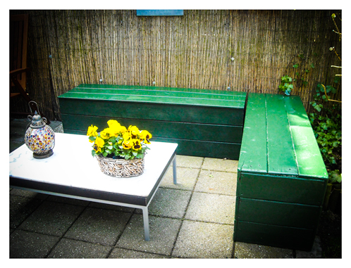 IK kan het helaas niet lezen maar ik neem aan dat de bank tevens opbergruimte is voor de hark, schoffel en wat men zoal bij het tuinieren nodig heeft.