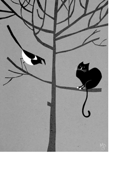 En ja hear; der sit in dikke reade kater ûnder de beam. Ik gryp de biezem en gean er achteroan. It aksterpear sjocht fan grutte hichte nei it wûnderlike minske ûnder de beam. Wat soe der yn hja omgean? Ik beslùt yn hûs te gean.