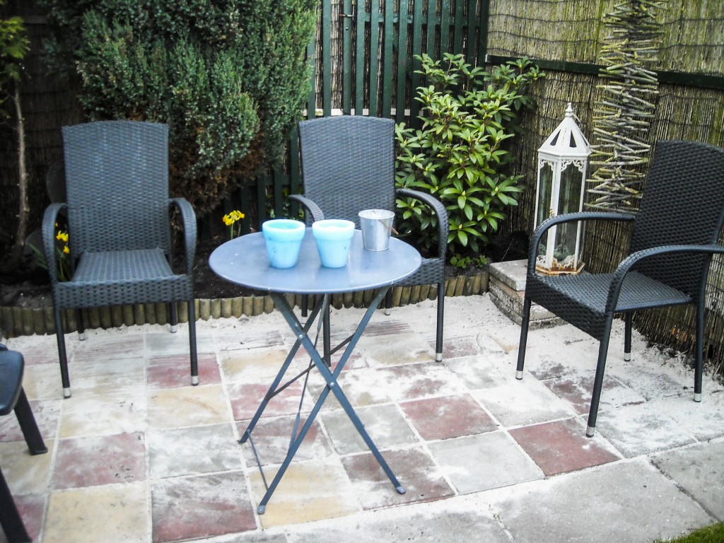 Nei dagen fan wrotten en bealgjen is myn terraske klear. Kroaden mei ùtgroeven modder fertôge fan it iene plak nei it oare. Doe moast er sân komme en wat er oerblean ùtsuttele yn `e buorren.