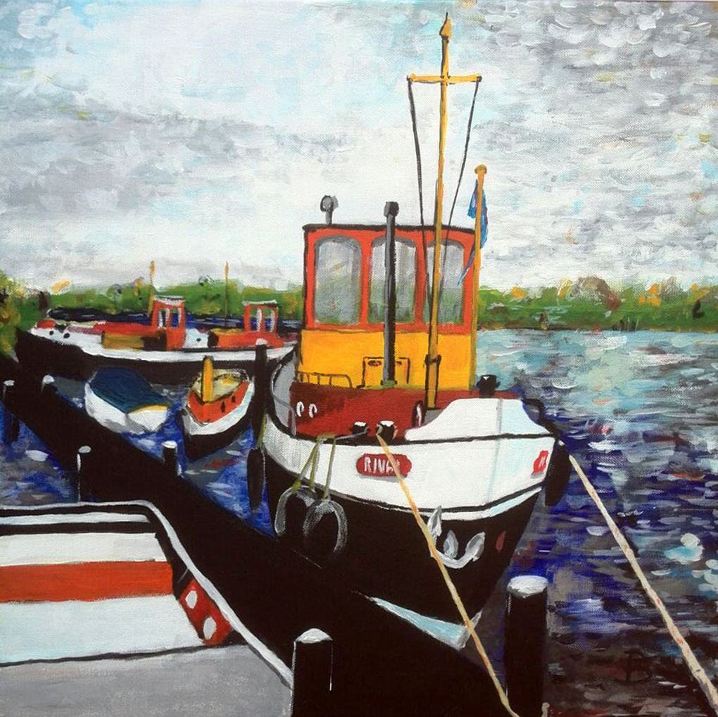 It is in sleepboatsje dat oan de kaai leit. Twa grutte lânfêsten hâlde him fêst oan de steiger. De skilder hat felle kleuren brûkt.