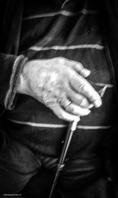 Hy sit tsjin oer my, syn hân om de knop fan de stok. De trouring om de oare finger want dy is te rom wurden.