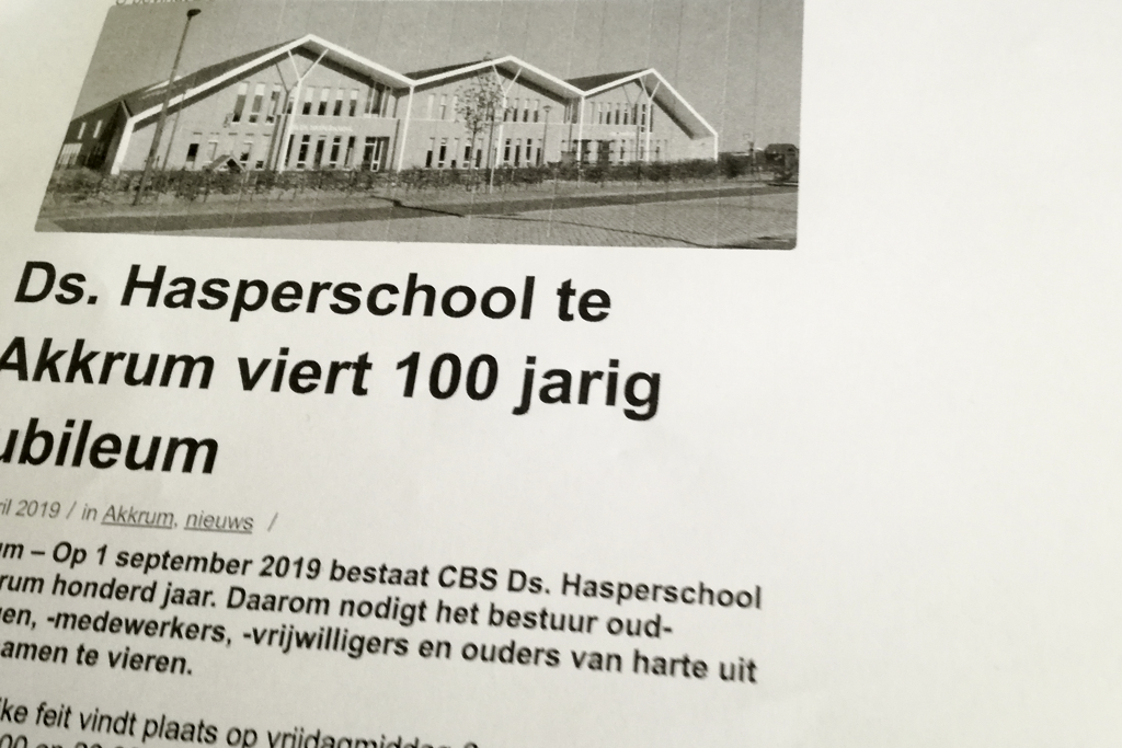 Dat allegearre gong oan myn each foarby do ik te witten kaam fan it hûndertjierrich bestean fan de Ds. Hasperskoalle.