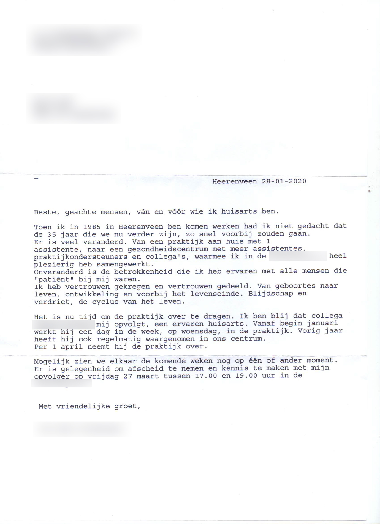 Mei in saaklik briefke lit ùs hûsarts witte dat hy mits âldens er mei ophâldt en in opfolger foar syn praktyk fûn hat.